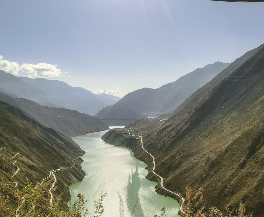 上嵐安的盤山路,在不停的彎折,每一個(gè)折又將路往上抬升一些,看著離大渡河越來越遠(yuǎn),應(yīng)該離嵐安近了。汽車在這條并不寬的路上行使,車窗外掠過的景色讓人有些意外。從來沒有從這個(gè)角度看過大渡河和沿河的景色,耀眼的陽光下,嵐安大橋橫跨大渡河,不遠(yuǎn)的地方是一個(gè)小村子,河水靜靜的流淌,平靜的河面如緞面般光滑。順著河流的方向,更遠(yuǎn)的地方就是雅康高速上的大渡河大橋,紅色的大橋在周圍藍(lán)的、綠的、灰的、白的顏色之中,很搶眼。這時(shí),我們走過的路,也在身后像一條細(xì)細(xì)的白色帶子繞在山坡上。路旁高高的野草隨風(fēng)而動(dòng),黃色的莖須像極了豐收時(shí)的青稞。因?yàn)槭堑谝淮蝸?,每一眼看見的都是新鮮,上山的路,也就沒有想象中艱難。不過,聽說這條還算平坦的水泥路是新修的,之前的土路,又窄又陡,遇到會(huì)車都是很困難的。