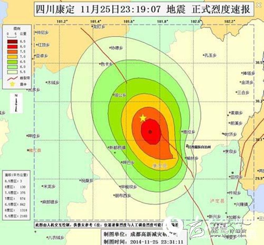 據(jù)人民網(wǎng)成都11月26日報道 記者剛剛從成都高新減災(zāi)研究所了解到,11月25日23時19分在四川省甘孜藏族自治州康定縣(北緯30.2度,東經(jīng)101.7度)發(fā)生5.8級地震,此次地震系康定6.3級地震的余震。