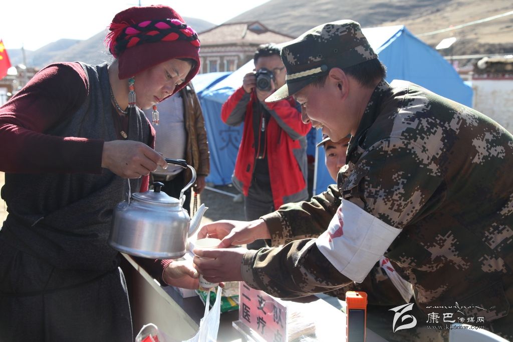 在江巴村牧民新村安置點,有兩位牧民婦女手里提著茶壺,她們后面跟著一位小女孩懷里抱著很多紙杯,見到有忙碌的抗災工作人員,她們就會為他們送上慢慢一杯噴香熱乎的酥油茶,嘴里一直念叨著:“你們辛苦了,感謝你們!”