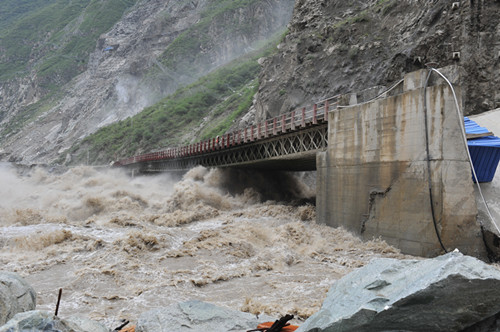 6月29日,恰逢周末,但在該公司的防汛指揮中心已是繁忙緊張氣氛,防汛值班員雖已熬紅了雙眼,緊盯著監(jiān)視屏并時刻保持與前方的聯(lián)系;7時23分,該公司副總經(jīng)理杜三林,長河壩工程部、安全環(huán)保部相關(guān)負責(zé)人來到了指揮中心;8時,流量逼近4170立方米每秒;10時,流量超過4200立方米每秒,已超過該工程自2010年開工以來最大流量,整個指揮中心的氣氛變得隨之凝重起來;10時30分至11時,指揮中心接連收到施工單位電話險情報告:此時此刻,長河壩工程初期導(dǎo)流洞水勢兇猛,導(dǎo)流洞出口橋0號橋臺回填料淘刷嚴重,1號橋墩發(fā)生傾斜,橋梁隨時有傾覆的可能,將會危及下游圍堰高程最低的中水十四局、中水五局營地的安全,更將會危及到300余名員工的人身安全;金湯河突發(fā)特大洪水,沖垮了通往金湯土料場的場內(nèi)公路,沿線山體已發(fā)生了小型泥石流,土料場通訊、交通已全部中斷,急需救援;持續(xù)降雨引發(fā)響水溝泥石流,3萬余立方米泥石流堆積物順溝而下,沖垮了響水溝石料場的鋼橋,并堵塞了場內(nèi)12號路1號隧道。必須馬上清運疏通,否則,響水溝再發(fā)泥石流,長河壩上游圍堰和大壩填筑工作面將直接面臨泥石流堆積物的直接沖擊,險情萬分緊急!